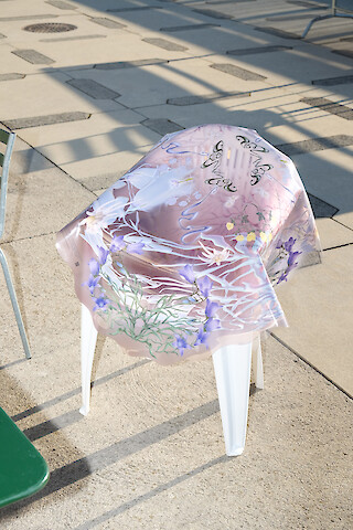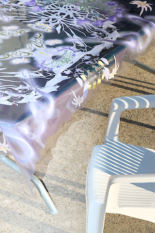 The tablecloth series Heimat.sichten [i.e. views of ‘Heimat’] gathers different perspectives and invites us to think about home, origin and identity. In the process, internalised clichéd images are subjected to aesthetic, material and content-related disruptions that have an irritating effect in the context of ‘Heimat’ and confront viewers with their own perspectives. Further, the table can be seen as a metaphorical space for negotiation in our society, in which we can act and think collectively. Which topics are subject to discussion, how are people talking to each other, and who decides who is allowed to join the table?