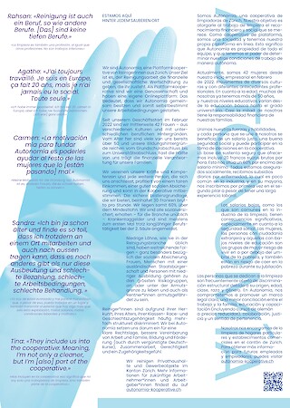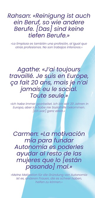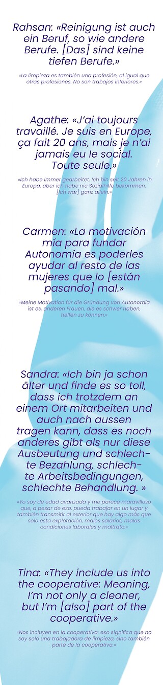Autonomía, eine der ersten Reinigungskooperativen der Schweiz, will das ändern und setzt am Punkt der Selbstbestimmung von Reiniger:innen an. Die in Kooperation mit Autonomía entstandene Kampagne basiert auf den individuellen Erfahrungen, Biografien und Sehnsüchten der Frauen und geht über ihren Arbeitsalltag hinaus: Sie handelt von Lohn und Stolz, Muttersein, Zukunftsplänen – und dem Reinigen selbst. Die Auseinandersetzung der Kampagne mit differenzierten Lebenswirklichkeiten sorgt für eine Sichtbarmachung und Sensibilisierung, im Ausblick auf eine Reinigungsbranche mit der finanziellen und gesellschaftlichen Wertschätzung, die ihr zusteht.