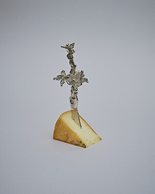 The set, consisting of five objects, is based on the classic Sunday cutlery, which is often placed in the middle of the table for representative purposes. It was crafted out of old 800 silver cutlery and can be redesigned many times through melting. It can thus respond formally and aesthetically to new, future nutritional ideals.