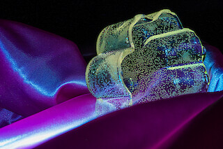 Zucker ist soziokulturell stark aufgeladen. Früher ein Genussmittel der Oberschicht, heute ungesunde Zutat mit Suchtfaktor. In flüssigem Zustand, süss, klebrig und glitzernd, lässt er sich vielfältig formen – auch zum kurzlebigen Statussymbol. Luxus und Exklusivität, Wohlstand und Überfluss materialisieren sich in den bunten Champagner-Coupes. Ihre verspielten Formen wecken Gefühle von Opulenz, Kitsch und Extravaganz. Mit Champagner gefüllt und als Assemblage arrangiert werden sie zu einer Installation zum Dahinschmelzen.