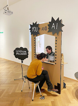 Trotzdem ist das endgültige Bild nicht so wichtig wie seine Entstehung selbst: Es ist ein iterativer Kurationsprozess, bei dem die Partizipation wichtiger ist, als das Ergebnis selbst. Bei den Durchführungen zeigte sich, dass die Teilnehmenden sehr lange bei der Installation verweilten (ca. 30min), aber trotzdem keine Person die entstandenen Bilder besitzen wollten. Das Erscheinungsbild der Installation soll auf einen spielerischen Diskurs hinweisen und wurde als eine Art «KI-osk» gebaut und von mir selbst bedient. Die unperfekte Bauweise und die Verwendung eines günstigen Materials sollten das Thema der Ausstellung aufgreifen.