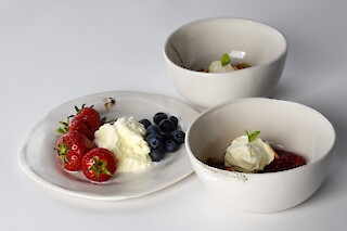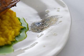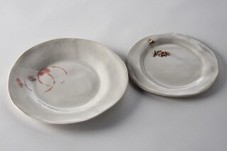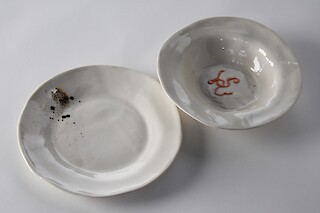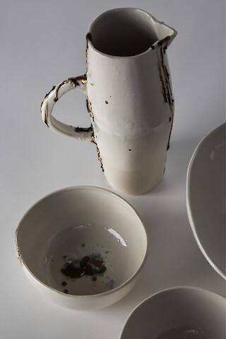 Die Geschirrkollektion setzt gezielt Irritationen in Szene. Fein verarbeitet und auf den ersten Blick makellos, offenbaren Teller, Tassen und Schalen bei näherem Hinsehen subtile Störungen: ein eingearbeitetes Haar, ein kaum sichtbarer Fleck, eine Unebenheit im Glasurverlauf. Eine klassisch-stilvolle Tafelsituation entpuppt sich als Spiel mit der Wahrnehmung.