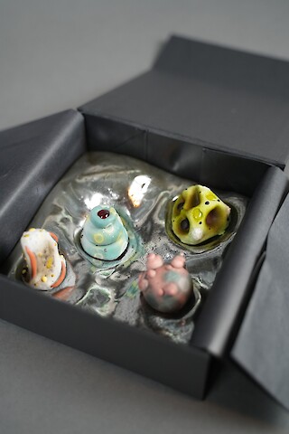 Myko explores the aesthetic and culinary dimensions of mould through experimental means. No longer seen as a flaw, mould is reinterpreted as a creative resource. A box of handcrafted confectionery presents unique pieces that oscillate between seductive chocolate and organic infestation. What may initially appear disturbing or even repulsive can, upon closer inspection, become captivating – both visually and in taste.